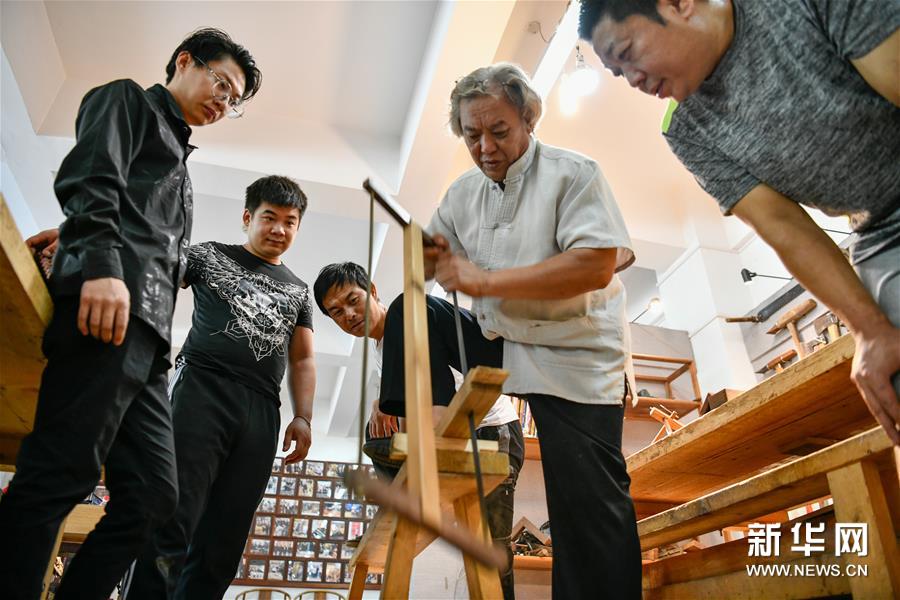 8月25日,在天津職業(yè)大學辛全生大師木藝工作室,辛全生(右二)給徒弟們演示開料流程。新華社發(fā)(孫凡越 攝)