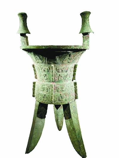 河南殷墟婦好墓出土的斝(音甲,飲酒器)本報(bào)記者 李韻攝/光明圖片