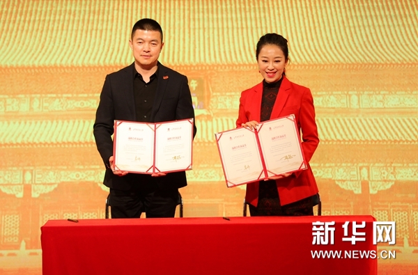 簽約儀式現(xiàn)場,左起故宮博物院副院長婁瑋與中央民族樂團(tuán)副團(tuán)長、琵琶演奏家趙聰合影。
