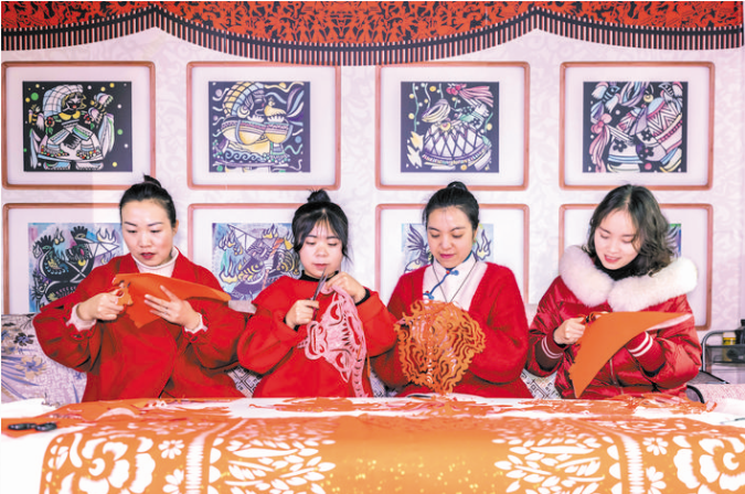 1月17日,岳紅霞(右二)帶領(lǐng)工作室學(xué)員創(chuàng)作“金牛送?!奔艏垺=?,曾獲全國(guó)剪紙大賽“金剪刀獎(jiǎng)”、貴州省畢節(jié)市黔西縣非遺傳承人岳紅霞帶領(lǐng)工作室學(xué)員創(chuàng)作“金牛送?!毕盗兄黝}作品,迎接農(nóng)歷牛年。 (新華社發(fā) 范暉 攝)