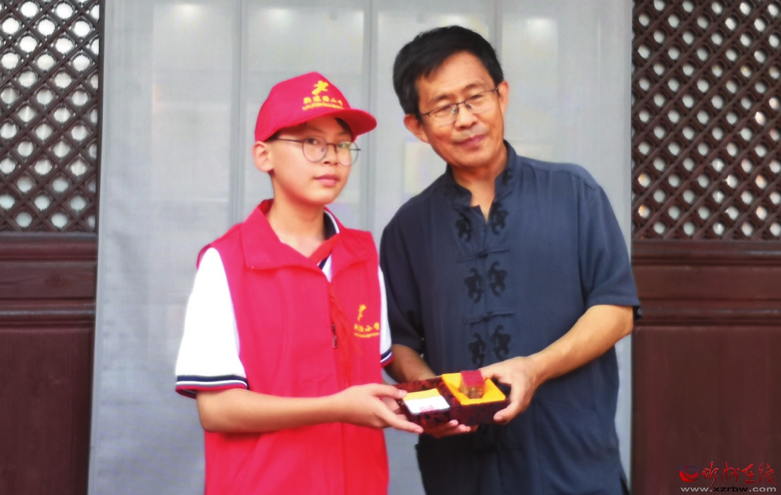 8月14日,忻府區(qū)新建路小學(xué)的史棟艇小朋友,在校長陳懷林帶領(lǐng)下,來到忻州古城秀容書院博物館,將自己精心刻制的一枚“秀容書院博物館”篆刻印章,贈送給秀容書院博物館,現(xiàn)場還舉行了一個簡單的贈送儀式。秀容書院博物館館長梁生智鄭重地接過這枚印章,并向史棟艇同學(xué)和陳校長表示了誠摯的謝意。