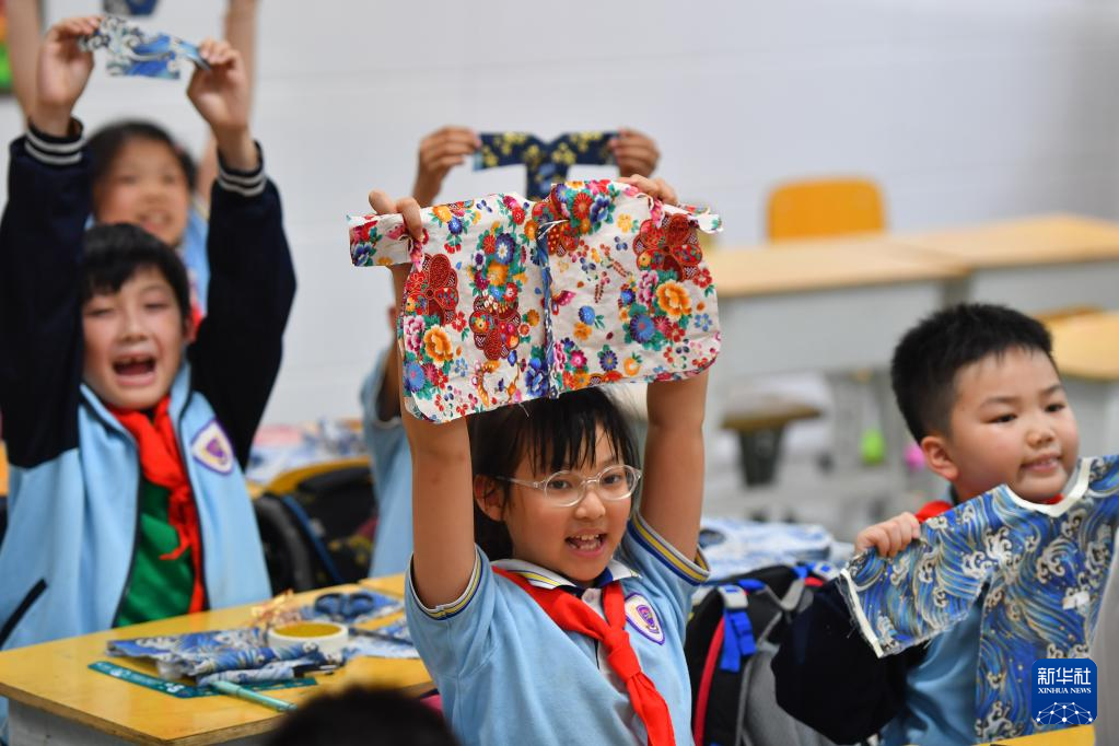 5月15日,在長沙市天心區(qū)紅衛(wèi)小學(xué),學(xué)生在傳統(tǒng)服飾設(shè)計(jì)課上展示作品。