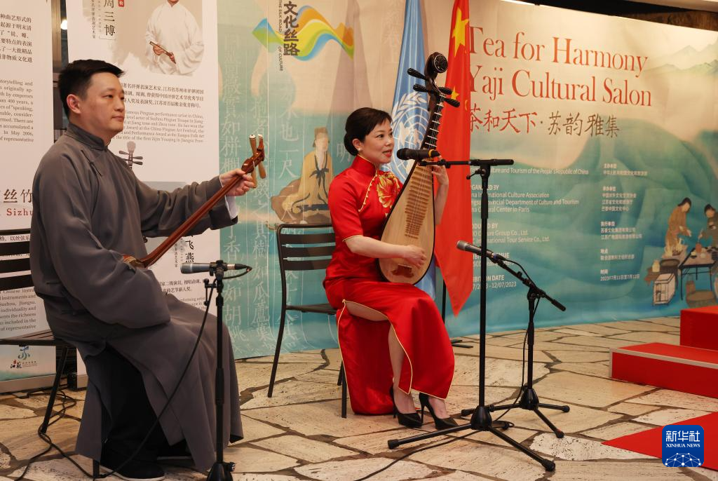 7月11日,在位于法國巴黎的聯(lián)合國教科文組織總部,中國評(píng)彈表演藝術(shù)家在活動(dòng)上演奏。