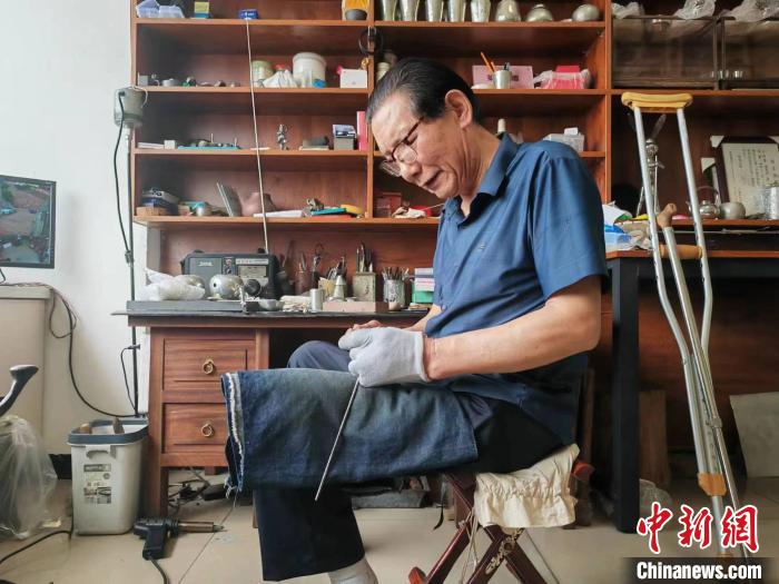 王圣良告訴記者,小時(shí)候他因?yàn)樯?,腿腳落下了殘疾,別的兄弟姐妹出去玩,他就跟著爺爺學(xué)習(xí)錫雕?!白鲥a雕需要心靜、身靜,因?yàn)樾凶卟环奖?,我比其他人更坐得住,在學(xué)習(xí)錫雕上更有‘優(yōu)勢(shì)’”。