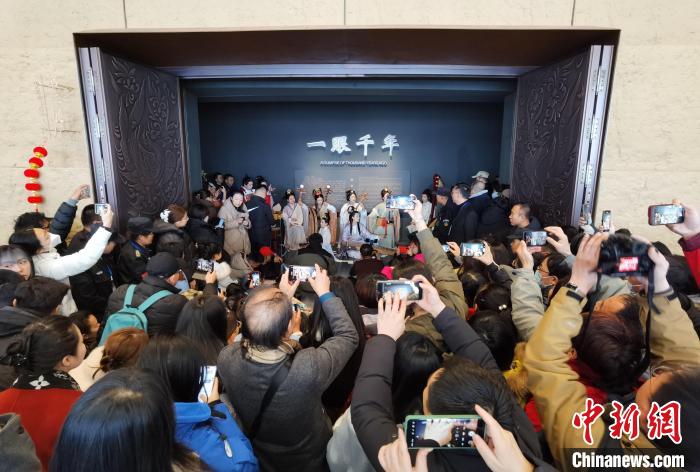 太原北齊壁畫(huà)博物館的“一眼千年”展廳,北齊武安王徐顯秀墓就陳列于此。來(lái)自文瀛雅樂(lè)社和竹里國(guó)樂(lè)團(tuán)的樂(lè)手,將塤、古琴、琵琶、箜篌、笛子等樂(lè)器演繹出《敦煌》《一眼千年》《春節(jié)序曲》,為民眾送福。