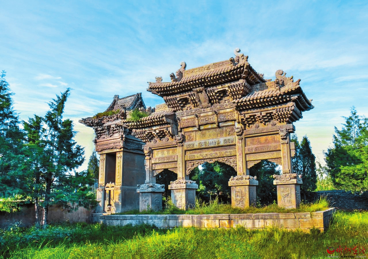 坐落于村中的朱氏牌樓是晚清中儀大夫、陜西延榆綏兵道加鹽運(yùn)使武訪疇為其母所修的節(jié)孝牌坊。它不僅見(jiàn)證了朱氏家族的輝煌歷史,也反映了當(dāng)時(shí)社會(huì)的文化風(fēng)貌,承載著豐富的歷史文化內(nèi)涵,為第八批全國(guó)重點(diǎn)文物保護(hù)單位。牌樓有主坊和配坊兩座,主坊矗立在村內(nèi)南街,面寬三間,四柱三樓,重檐歇山頂,高近11米、寬15米。欄板內(nèi)剔底雕刻成一幅幅人物故事圖案,霸王柱間鏤雕丹鳳朝陽(yáng)。匾形走馬板上書(shū)“柏舟矢志”“竹柏流芳”各四字。牌坊下檐明間置匾一塊,書(shū)“圣旨”二字,兩次間匾書(shū)分別為“懿范”“徽音”。配坊在村南,高8米有余,四柱三門(mén),單檐歇山頂,規(guī)模略小,造型風(fēng)格與主坊一樣,皆為石雕藝術(shù)精品。
