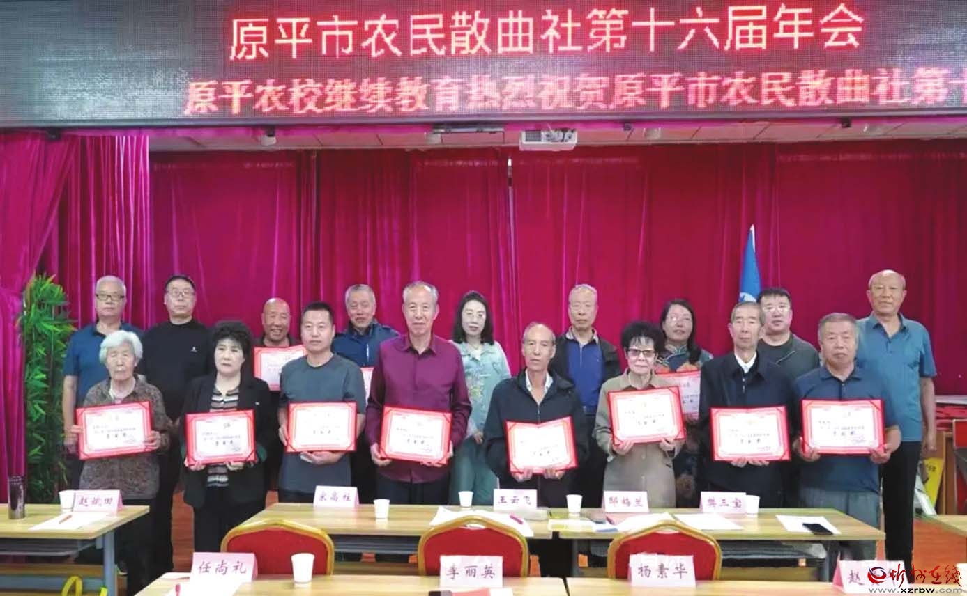 散曲社朗誦部的曲友們在悠揚音樂聲中,激情澎湃地朗誦著五谷飄香的農民散曲,20多名優(yōu)秀社員受到表彰,展示出原平農民散曲的喜慶豐收景象。“詩如潮,農民種曲名聲在,情如火,南腔北調心澎湃。曲如海,同舟共濟承傳愛,暖如春,一年四季花不敗?;ㄩ_滿地鮮,曲韻熔天籟,好一個震驚曲界田園派?!边@首散曲《正宮·塞鴻秋》道出了散曲社社員們的心聲。