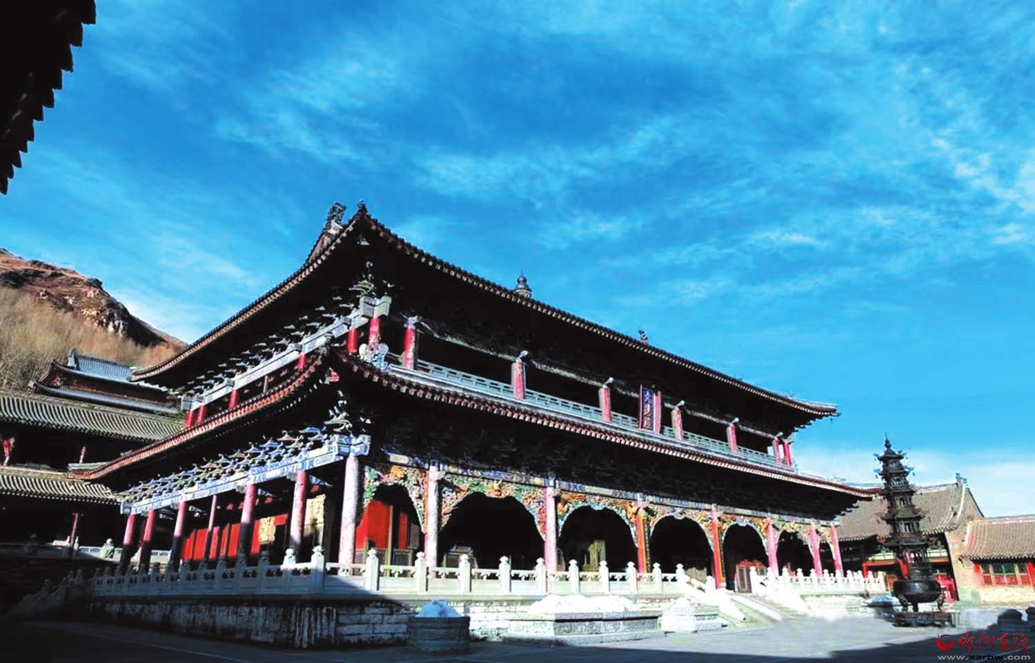 經(jīng)過懸掛著“金閣浮空”匾額的木牌坊,沿著108級漢白玉石臺階拾級而上,山門處沉靜肅穆。放慢腳步,深深呼吸,感受空氣的清新與純凈,感受獨(dú)有的靜謐與祥和。走進(jìn)寺內(nèi),仿佛穿越時(shí)空,抵達(dá)一個(gè)與世隔絕的佛國世界。