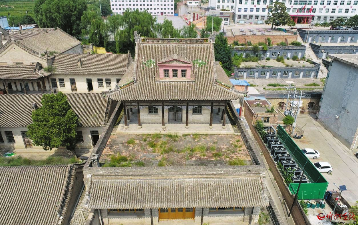 第四層平臺上,正對中軸線門洞的是大禮堂。大禮堂坐北朝南,長45米、寬24米。禮堂前設(shè)卷棚歇山抱廈3間,石雕柱礎(chǔ)石,木雕圈口暗八仙,柱間雀替鏤空雕刻花卉、飛禽等圖案。斗拱三踩,柱頭科耍頭萬字形,平身科耍頭龍形。禮堂內(nèi)置天花板,主席臺前木雕欄桿,上部設(shè)垂蓮柱;禮堂外左右各有5間教室,邊上為回長廊。禮堂后建石券窯洞9間,為教師宿舍,窯洞頂建木結(jié)構(gòu)房間15間,為教學(xué)辦公區(qū);禮堂西側(cè)是寬闊的操場。