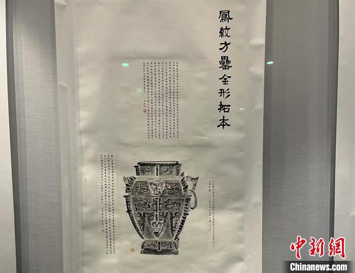 武漢博物館“墨拓千秋——金石器物全形傳拓技藝保護成果展”展出的鳳紋方罍全形拓本。 中新社記者 武一力 攝