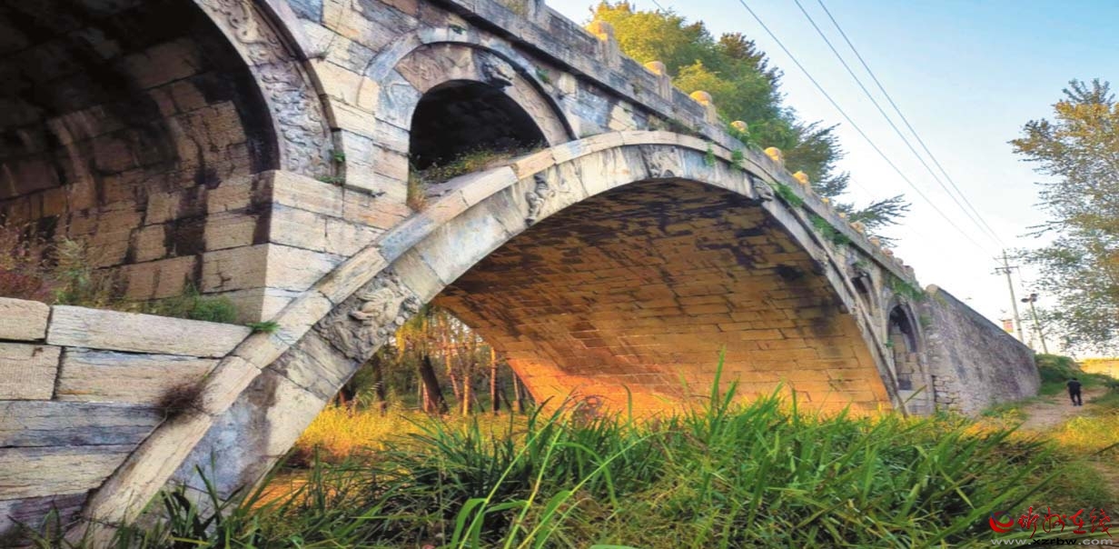 這座石砌拱撟,用行鏨石和雕刻石砌成,主橋全長30米,寬8米,高7米。兩端各有一引橋,橋身兩邊均置雕石實體欄桿,分別有望柱20根、欄板19塊,方正的望柱頂部有仙桃、石榴、佛手等果品石雕,欄板系整石卷邊鏤花。石橋體由單孔長券和4個小券孔組成,券口邊框和券楣均有造型精美、工藝考究的石刻浮雕。大券口除兩邊雕有汲水獸頭像外,還雕有故事人物組畫16幅;小券口邊上雕有蛟龍出水及九針圖案等。所有雕飾典雅精致,線條流暢,活靈活現(xiàn),寓意深刻。橋面用石板鋪筑,分三個行道,由兩條與橋身走向一致的立石帶分隔。