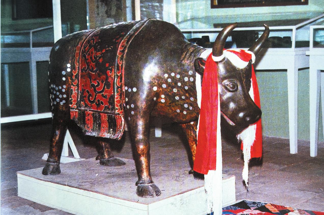 五臺(tái)山保存著一尊工藝精細(xì)、形態(tài)逼真、傳神入化的明代銅牛。這尊堪稱(chēng)鑄造藝術(shù)品中佳品的銅牛,收藏在顯通寺藏珍樓內(nèi),通高85厘米,長(zhǎng)146厘米。它體魄雄偉,頭向前伸,分足而立,兩角內(nèi)收,閉嘴蓄力,圓目正視,奮力前行。銅牛四足協(xié)調(diào),造型逼真。銅牛的腰部有披墊,披墊上面繪有各種彩色花紋。銅牛原來(lái)還拉著一輛精致的銅車(chē)。車(chē)棚、輪、軸及車(chē)上的繩索均為銅質(zhì)。文物部門(mén)鑒定其為國(guó)家一級(jí)文物。