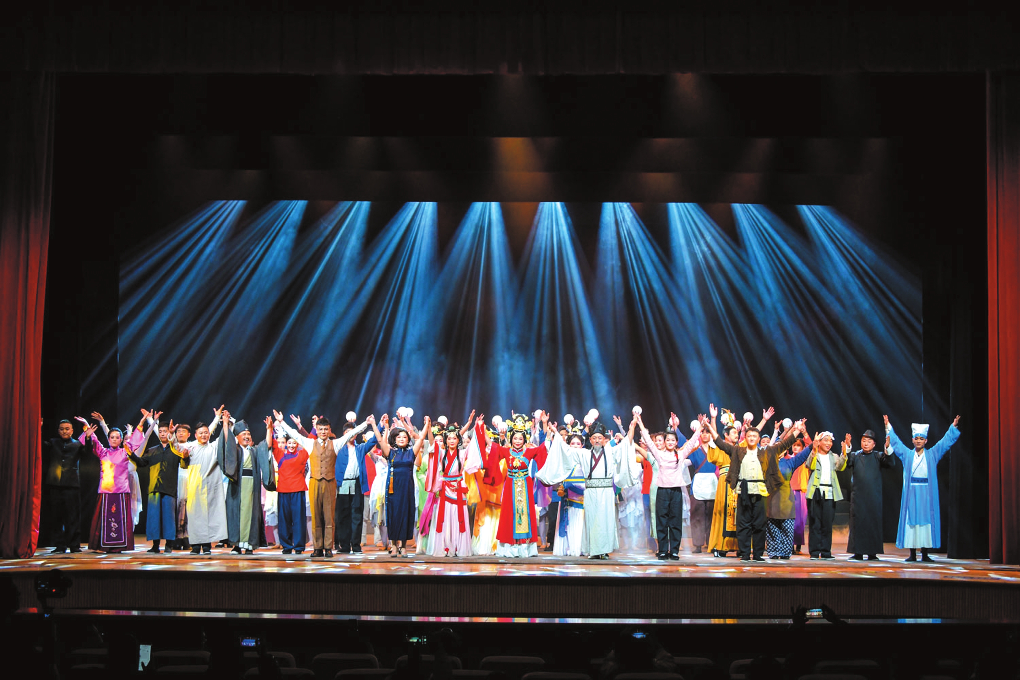 “唯美空靈,耳目一新,一看就是年輕人的創(chuàng)意!” “表演形式豐富,呈現(xiàn)內(nèi)容深刻,沒想到在忻州還能看到這么高級的舞臺劇!” “臺上人物那么多,但一點也不亂,能讓人靜下心來看進(jìn)去,夠味!” …… 11月16日—18日,新編文化旅游演藝節(jié)目《秀容千秋頌》在忻州劇院首演。這部由山西省文化產(chǎn)業(yè)發(fā)展專項資金資助、忻州文化研究院直屬的忻州市二人臺劇團(tuán)有限公司精心打造的大型文旅劇,現(xiàn)場獲得一波又一波熱烈掌聲的同時,收獲了眾多觀眾意猶未盡的好評。 透過這場傾全團(tuán)之力打造的劇目,我們隱約看到,作為我市文化傳播的重要力量,二人臺劇團(tuán)在傳承地域文化、豐富群眾精神生活方面守正創(chuàng)新,正積極探索傳統(tǒng)藝術(shù)與現(xiàn)代需求融合發(fā)展的新路徑。 無形之魂化為有形之景 潔白的紗幕,隔開了舞臺與觀眾。彩墨暈染之間,一把琵琶,仿佛想要訴說些什么。當(dāng)這絢麗唯美的畫面以多媒體的手法投影在紗幕上的瞬間,觀眾便感受到強烈的視覺沖擊。 鼓書表演出現(xiàn)在舞臺一角,以邊鼓邊唱的形式,從聽覺上再次吸引了觀眾。精彩的唱詞、優(yōu)美的聲腔,撥動了觀眾席上每個人的心弦,一下子把大家?guī)肽莻€特定的歷史時空。隨著大幕緩緩升起,人物和場景出現(xiàn)在舞臺上,大戲從此開場。 《秀容千秋頌》的打造是二人臺劇團(tuán)在助力文旅融合中的一次大膽創(chuàng)新和嘗試。劇目一改傳統(tǒng)的二人臺唱腔和單調(diào)的表現(xiàn)形式,一改戲劇扁平而漫長的敘事方式,融合了鼓書、舞蹈、歌曲、戲劇、話劇等多種表演形式,用電影蒙太奇的手法,意象式地呈現(xiàn)。同時,應(yīng)用現(xiàn)代舞臺技術(shù)與多媒體視覺效果,往往一束光柱的移動,就改變一個時空,氛圍感拉滿,節(jié)奏跳躍而流暢,使劇目的敘事張力與藝術(shù)感染力大大增強。 《秀容千秋頌》以與忻州地域相關(guān)的故事和人物為原型,將歷史人物的精神內(nèi)核提煉為戲劇語言,通過四幕情感遞進(jìn)、結(jié)構(gòu)分明的篇章,呈現(xiàn)了歷史長河中可歌可泣的忻州故事和精神傳承。每一個篇章,都以鼓書為引子,引出不同的歷史片段和人物,珠鏈般串起了王昭君、元好問、走西口人、高君宇等舞臺人物的歷史面貌和精神氣象。四段故事既獨立成章,又一脈相承,以時間軸為序,藝術(shù)地呈現(xiàn)了忻州深厚的文化底蘊和自強不息、勇于擔(dān)當(dāng)?shù)木竦咨?/p> 第一幕《奉獻(xiàn)》。漢代王昭君并非忻州人,但她與雁門關(guān)有關(guān)。劇中展現(xiàn)了王昭君犧牲個人幸福,通過和親化干戈為玉帛,維護(hù)國家穩(wěn)定的奉獻(xiàn)精神。王昭君出塞途經(jīng)雁門關(guān)進(jìn)入漠北,在忻州大地回望故國,抱著琵琶悲痛歌唱。演員們以生動鮮活的表演和高亢細(xì)膩的唱腔,把她遠(yuǎn)離故土、舍身促進(jìn)民族融合的義舉展現(xiàn)得淋漓盡致。 第二幕《初心》。金元時期大詩人元好問,是現(xiàn)忻州忻府區(qū)(古稱秀容)人。16歲的元好問在趕考途中路遇被人射殺的大雁及另一只殉情而死的大雁,寫下了“問世間,情是何物”的千古絕句。劇情以此為切入口,講述了一代文宗在家國離亂中的文化堅守。以群舞、雙人舞的表演,對人與雁之間的情感加以烘托,以不同時期的元好問為精神意象展開對話,舞姿優(yōu)美、氛圍熱烈,發(fā)問深刻,引發(fā)觀眾深深的共鳴。 第三幕《堅韌》。清末民初,走西口曾是忻州數(shù)輩人無奈之下的決絕選擇。劇情以走西口群體的艱辛經(jīng)歷為背景,重現(xiàn)了走西口的忻州人,向往美好生活卻遭遇男女之間生離死別的故事情節(jié)。演員表演接地氣、精神內(nèi)涵挖掘豐富,以特定的場景營造和閃回式場景再現(xiàn),展現(xiàn)了走西口人勇闖天下、堅韌不拔、寬厚仁義的精神品質(zhì)。 第四幕《信念》。19世紀(jì)20年代,忻州靜樂人高君宇,以短暫而絢爛的人生,給后世留下永不磨滅的熱血記憶。劇情以高君宇革命場景展現(xiàn)、高君宇與石評梅的戀愛場景展現(xiàn),把覺醒年代革命青年形象刻畫得有血有肉。最后以畫外音的形式,以現(xiàn)代人與高君宇穿越時空的對話,讓人們看到了共產(chǎn)黨革命先驅(qū)高君宇精神世界的崇高與豐富。 整部情景劇在90分鐘的時間內(nèi)“裝”進(jìn)了4個不同的歷史人物、5種以上表演藝術(shù)、70多個演員角色,舞美燈光唯美驚艷,敘事角度新穎別致,原創(chuàng)音樂走心入耳,編劇文本生動細(xì)膩,青年演員充滿活力,最終為觀眾呈現(xiàn)了一臺藝術(shù)感染力很強的演出,特別受到年輕觀眾的喜愛。 這是二人臺劇團(tuán)繼去年打造了《雁門關(guān)下》這部大戲后的又一次突破性嘗試。 借梯登高打造文化精品 忻州有眾多的文化元素,這部情景劇從文旅融合的角度出發(fā),選取了三個有代表性的歷史名人和“走西口”文化現(xiàn)象,以人文精神為核心,使作品有了較強的忻州地域?qū)傩?,最終呈現(xiàn)了一臺藝術(shù)性和思想性兼具,歷史厚重感和現(xiàn)代審美融合的文旅演藝節(jié)目。 從編劇、導(dǎo)演到演員,全方位用力,以創(chuàng)新角度講述忻州故事,嘗試打通與觀眾的距離、打通與年輕人的心理距離。最終各種嘗試也確實提升了整部情景劇的藝術(shù)感染力。這也足