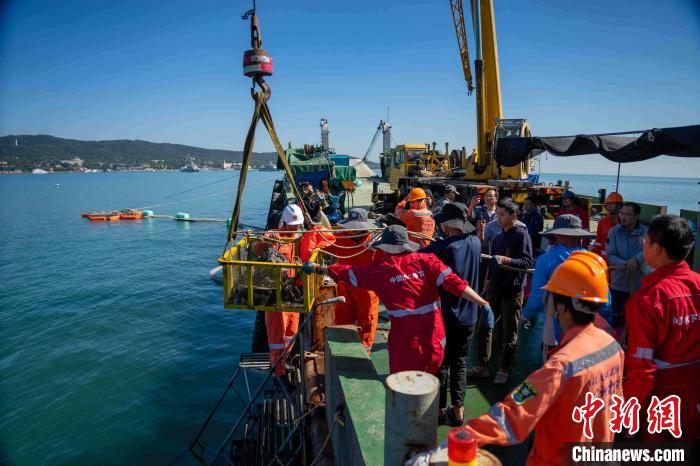 資料圖:考古人員在現(xiàn)場起吊彈藥箱。山東省水下考古研究中心供圖