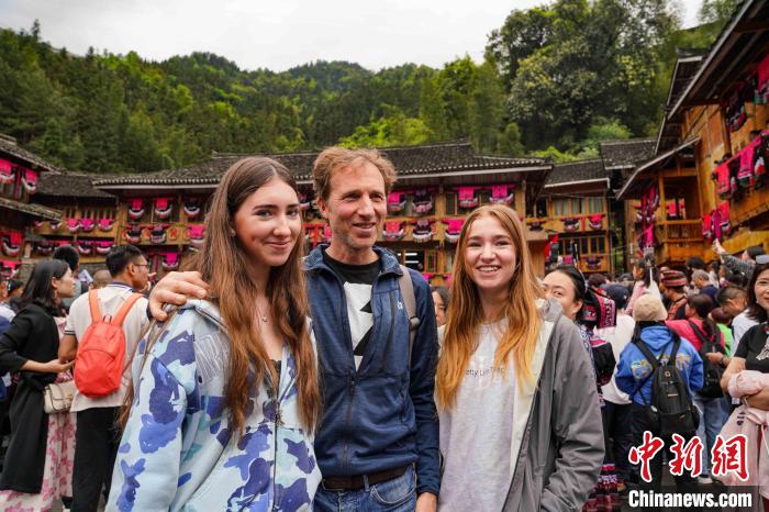 4月11日,在廣西桂林市龍勝各族自治縣龍脊梯田景區(qū)黃洛瑤寨,外國友人合影留念。 楊宗盛 攝