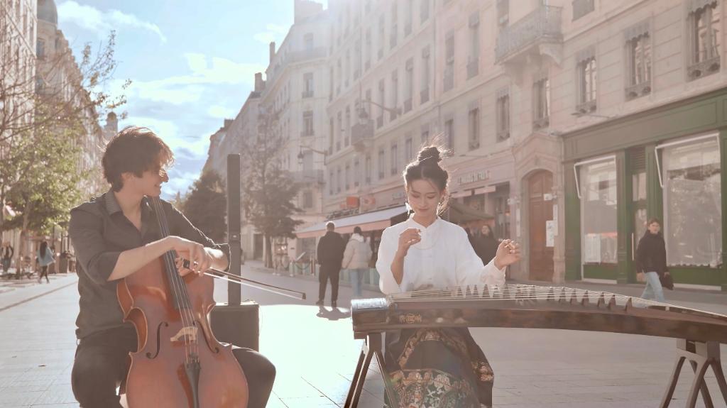 去年冬天,彭靜旋邀請(qǐng)法國大提琴家菲利克斯一起合作。一個(gè)是低頻濃厚的線狀樂器,一個(gè)是高頻清亮的點(diǎn)狀樂器,在陽光明媚的下午,一首《浮光》在里昂街頭奏響。