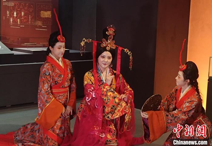 展覽現(xiàn)場(chǎng)的情景秀表演,再現(xiàn)“漁陽(yáng)王后”(中)的生活日常。中新網(wǎng)記者 鄧霞 攝