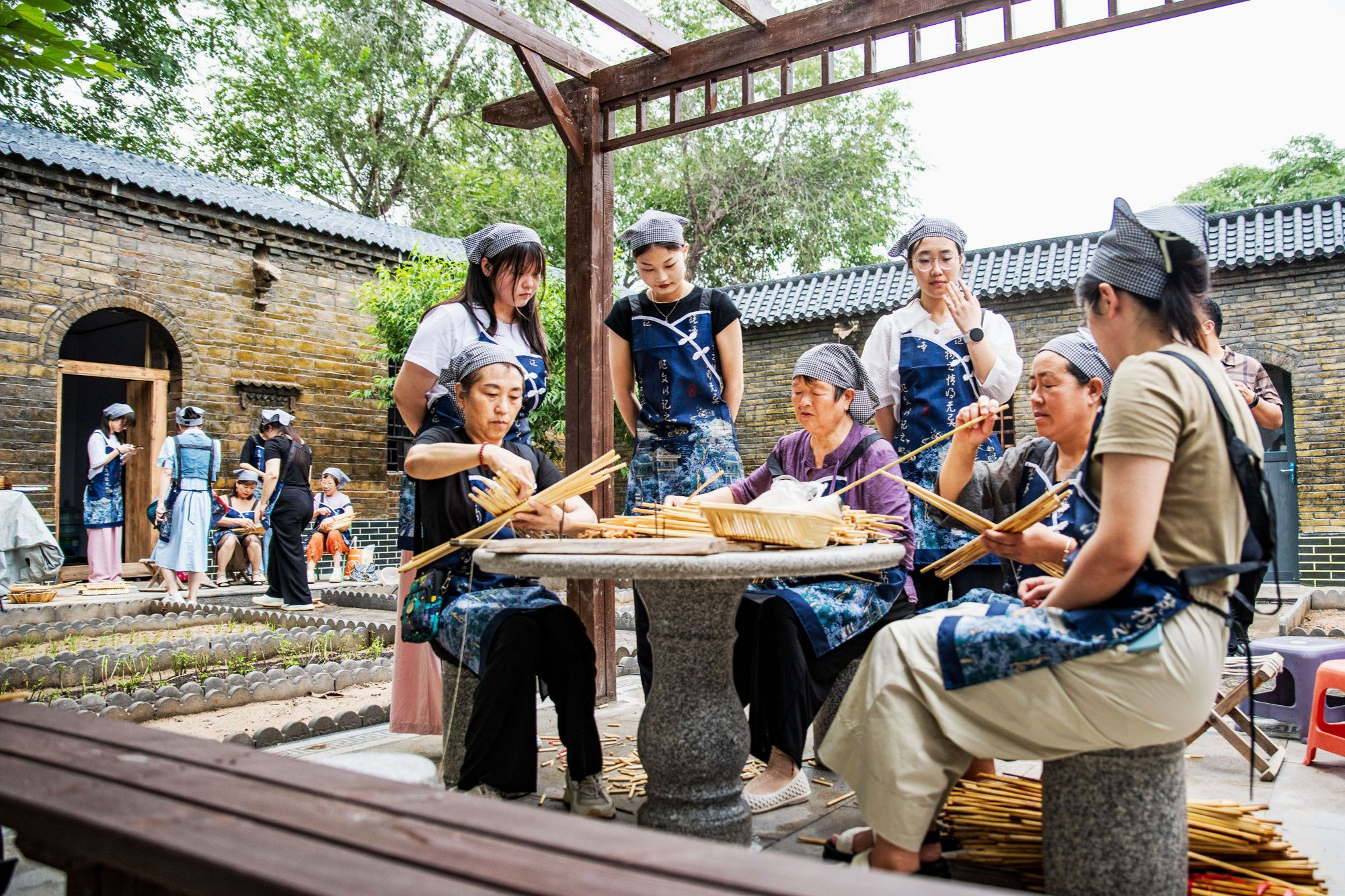 近日,在河北省高陽(yáng)縣斗洼村“保定小院”內(nèi),民間老藝人教一群學(xué)生學(xué)做箅簾、兜嘍箅,傳承民間技藝,體驗(yàn)傳統(tǒng)文化,賦予“保定小院”文化氣息。