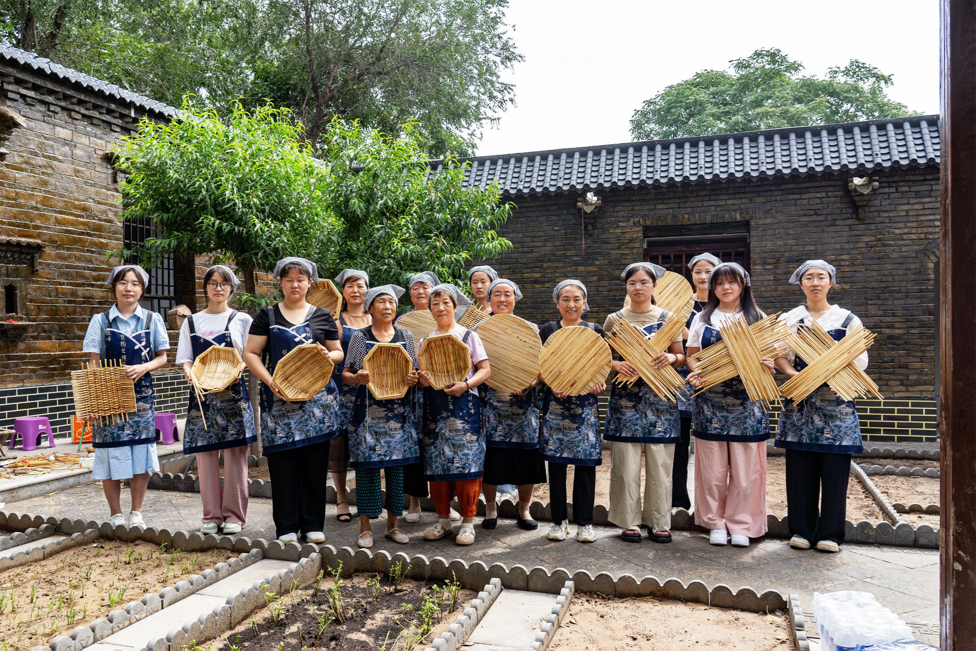 現(xiàn)場(chǎng),青磚灰瓦老式房屋建筑,充滿年代感。幾位年近70歲的老藝人在院中圍坐,制作起箅簾來(lái)動(dòng)作嫻熟,眼隨手走,針線在高粱稈間上下穿梭,擠緊、壓實(shí)、細(xì)縫、剪圓,每道工序十分嚴(yán)謹(jǐn)。學(xué)生們有模有樣地學(xué)做,不時(shí)向老人請(qǐng)教交流,現(xiàn)場(chǎng)氣氛活躍、趣味十足。一個(gè)多小時(shí),一個(gè)個(gè)手工制作的箅簾、兜嘍箅基本成型,看著自己的勞動(dòng)成果,大家臉上洋溢著喜悅的笑容。