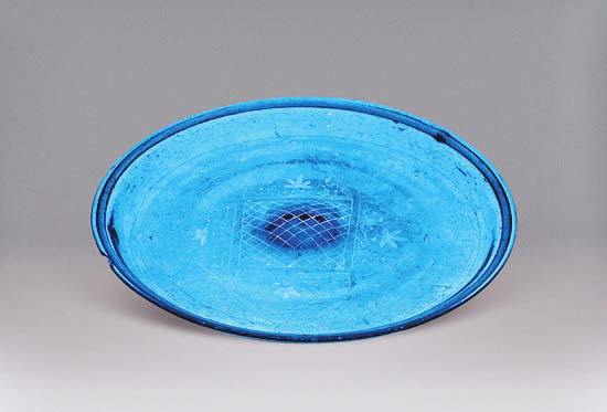 據(jù)地宮出土的物賬碑記載,整個(gè)地宮被布置得“窮天上之莊嚴(yán),極人間之煥麗”。在這些文物中,有六件來(lái)自阿拉伯國(guó)家的刻紋藍(lán)玻璃盤(pán)。玻璃盤(pán)保存完好,為無(wú)模吹制成形,通體藍(lán)色,晶瑩光潔,盤(pán)面刻滿紋飾,主體紋飾為以雙線勾勒出的十字形框架,盤(pán)心為正方形方框,方框外刻四個(gè)拱門(mén)形狀的尖瓣,與中心方框組成四個(gè)“米哈拉布”紋樣?!懊坠肌笔且了固m教清真寺大殿的禮拜龕,四個(gè)尖瓣內(nèi)各刻一朵五瓣葉子植物紋,尖瓣之間也飾以植物紋。制作工藝是在玻璃成器之后,用比玻璃更堅(jiān)硬的工具在其表面淺刻花紋,加以描金,從而使得玻璃盤(pán)更為華麗。