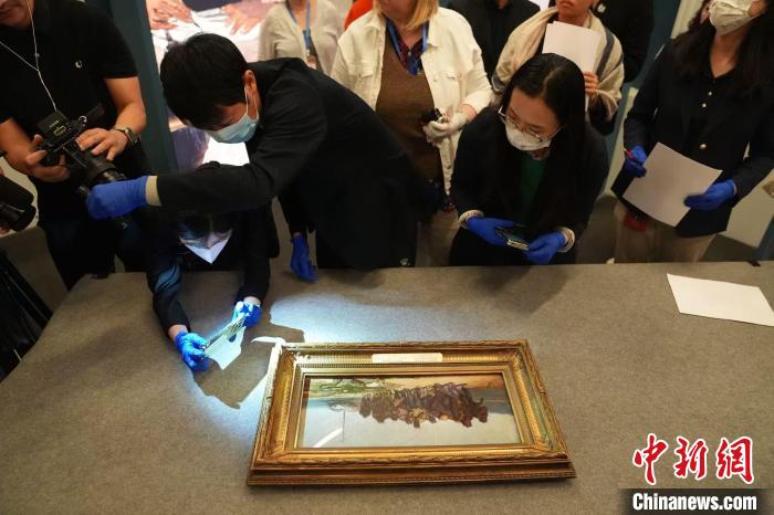 中俄兩國(guó)專家共同檢視剛開箱的《伏爾加河上的纖夫》油畫草圖。 史春陽(yáng) 攝