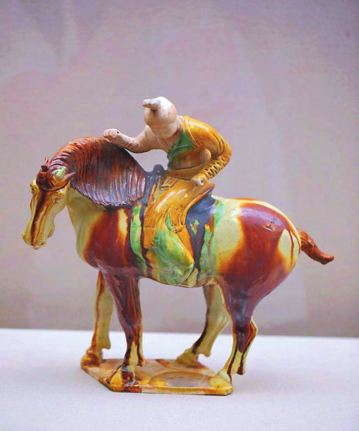 唐代女子也熱愛(ài)打馬球,《明皇擊球圖》展現(xiàn)了唐玄宗與后宮妃嬪打馬球的場(chǎng)景,河南洛陽(yáng)唐代王雄誕夫人魏氏墓曾出土四件三彩打馬球女俑。唐代詩(shī)文中也有女子打球的記載,王建《送裴相公上太原》中寫(xiě)“千群白刃兵迎節(jié),十對(duì)紅妝妓打球”,張籍的《寒食內(nèi)宴二首》亦云“廊下御廚分冷食,殿前香騎逐飛球”的詩(shī)句。由于馬球運(yùn)動(dòng)的流行,唐代有很多與馬球相關(guān)的文物,流傳至今的馬球、球桿、球場(chǎng)碑石、繪畫(huà)、泥塑等數(shù)不勝數(shù)。
