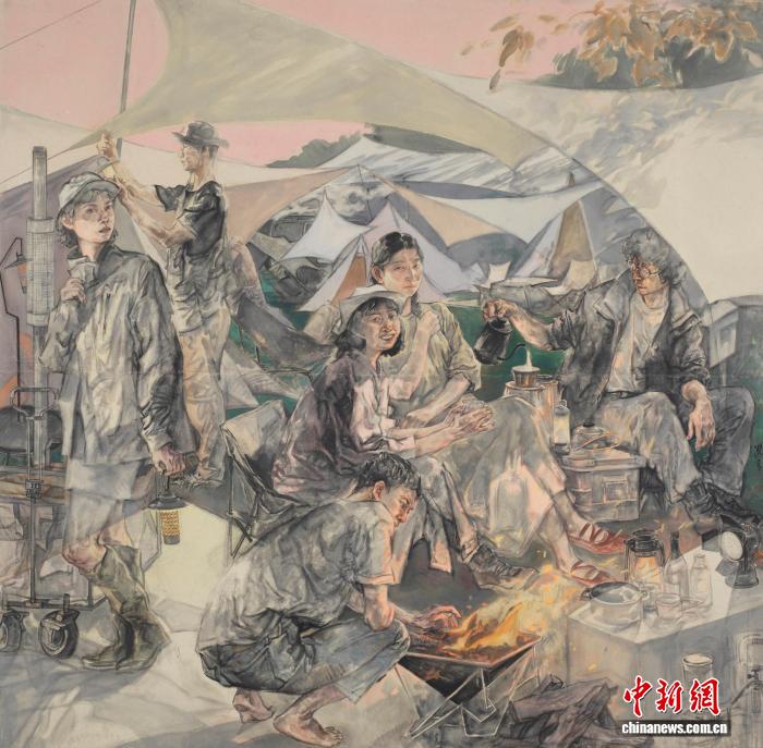 以畫家藺潔青的中國(guó)畫《清風(fēng)徐來》為例,其是浙江省第十五屆美術(shù)作品展金獎(jiǎng)作品,以傳統(tǒng)人物畫技法表現(xiàn)當(dāng)代青年郊野露營(yíng)場(chǎng)景,通過描繪清風(fēng)拂過林間被永恒定格的瞬間,傳遞都市人向往自然、追求心靈自由的當(dāng)代精神,展現(xiàn)出中國(guó)傳統(tǒng)繪畫語(yǔ)言在表現(xiàn)現(xiàn)實(shí)題材上的蓬勃生命力。