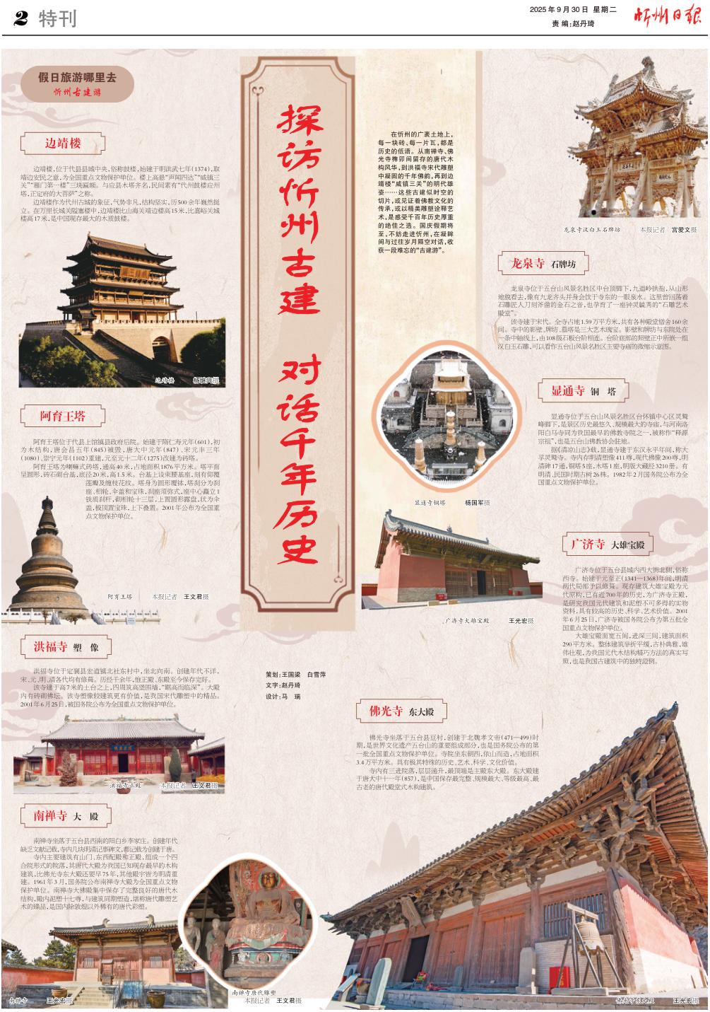 在忻州的廣袤土地上,每一塊磚、每一片瓦,都是歷史的低語(yǔ)。從南禪寺、佛光寺榫卯間留存的唐代木構(gòu)風(fēng)華,到洪福寺宋代雕塑中凝固的千年佛韻,再到邊靖樓“威鎮(zhèn)三關(guān)”的明代雄姿……這些古建似時(shí)空的切片,或見證著佛教文化的傳承,或以精美雕塑詮釋藝術(shù),是感受千百年歷史厚重的絕佳之選。國(guó)慶假期將至,不妨走進(jìn)忻州,在凝眸間與過往歲月隔空對(duì)話,收獲一段難忘的“古建游”。