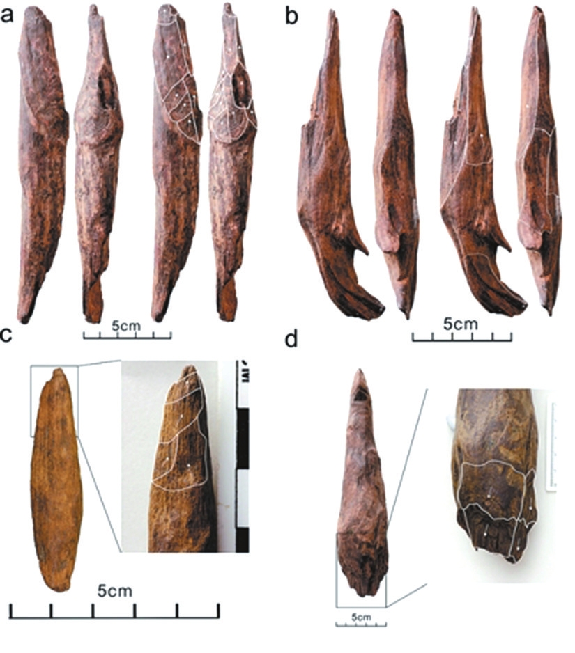 在沒有鎬、鏟等金屬工具的情況下,生活在甘棠箐遺址的古人群是如何將深埋于地下的可食性植物根塊挖掘出來并加以食用的?遺址出土的木質材料給我們提供了答案:古人類制作和使用了木器。在該遺址發(fā)掘出土的近千件木質材料中,35件被鑒定為人類加工的木器。這些木器主要用松樹制作,器身挺直光滑,一端或兩端被加工成尖狀,尖部形態(tài)包括鑿型、鏟型、錐型等。其中兩件是需雙手持握的大型挖掘棒,還有4件具有獨特的鉤狀尖刃,可用于切斷植物根系,其余則為可單手持握的小型挖掘工具。