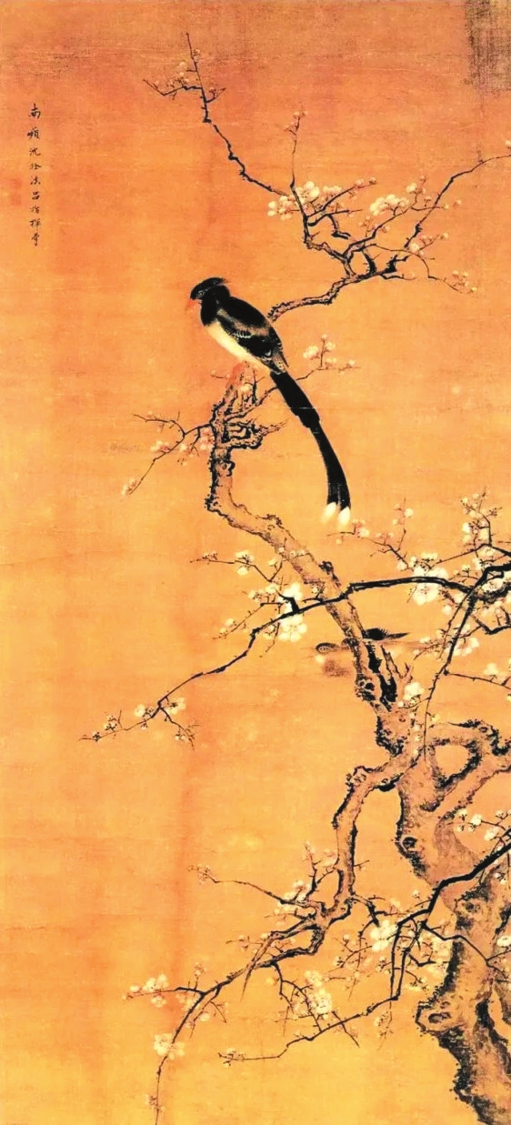 宋代畫家筆下的梅花大都與禽鳥有所關聯(lián),這主要得益于花鳥畫在此時的繁盛之勢。宋徽宗趙佶的《臘梅山禽圖》就把梅花與白頭翁聯(lián)系起來,描繪了在乍暖還寒的季節(jié)里,兩只相伴而生的白頭翁立于臘梅枝頭的場景,給觀者帶來復蘇之感。作品左下角題詩“山禽矜逸態(tài),梅粉弄輕柔。已有丹青約,千秋指白頭”,表達了愛情之思。因為白頭翁在傳統(tǒng)文化中象征吉祥與幸福,是對白頭偕老的隱喻,當它與梅花結合起來時,便會強化人們對美好愛情的聯(lián)想。