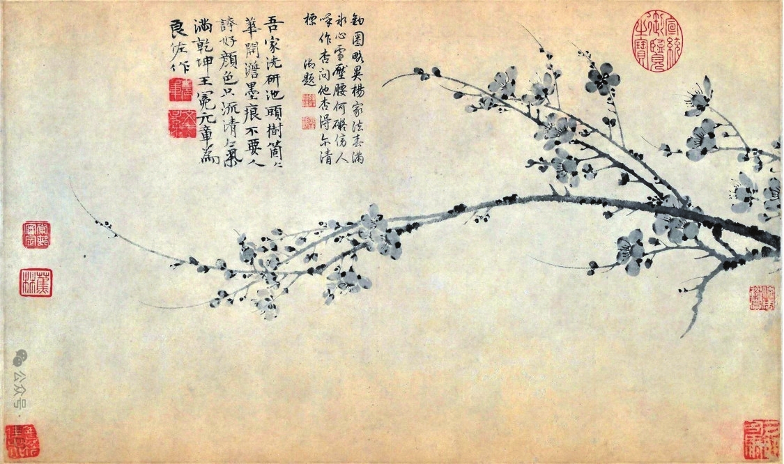 以梅入畫,最早出現(xiàn)于南北朝時期,不過并未成氣候,直到宋代,以梅花入題的中國畫才顯露實績。人們所熟知的“梅妻鶴子”典故與北宋隱士林逋有關,雖以愛梅著稱,但他并無梅花繪畫作品傳世。被稱為“墨梅始祖”的僧人仲仁亦活躍于宋代,他以水墨深淺描摹梅花,全然摒棄色彩,后世稱之為“墨梅”。