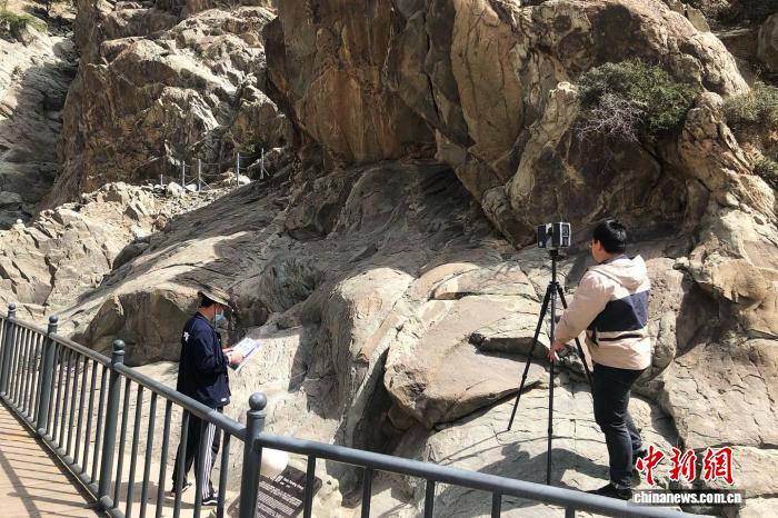 賀蘭山巖畫(huà)區(qū)域測(cè)繪與本體數(shù)字化留存項(xiàng)目開(kāi)展期間,工作人員在賀蘭山巖畫(huà)遺址進(jìn)行數(shù)據(jù)采集工作。(資料圖)銀川市賀蘭山巖畫(huà)管理處供圖