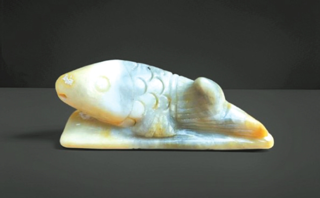 筆者藏有一件“魚躍竹排”白玉筆架,長10厘米,寬2.5厘米,高3.6厘米。筆架雕一碩大魚兒躍于竹排之上,以雙鰭為支撐,魚尾舒展,一側(cè)貼于排面,另一側(cè)微微傾斜向上、向左卷曲,恰好承筆;魚頭昂揚(yáng),宛如一幅魚乘竹排、暢游河中的立體畫卷。