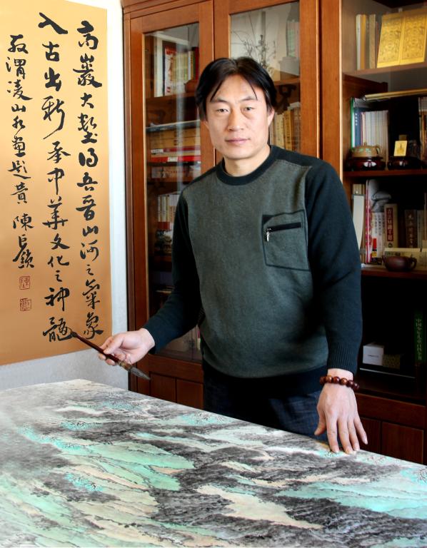 認(rèn)識殷渭凌,是先認(rèn)識他的畫,前幾年在一次省里畫展上看到了一幅山水畫,淳樸、厚重,樸實(shí)的親切、厚重的實(shí)在,完全沒有近幾年流行的風(fēng)氣,也沒有長期臨摹傳統(tǒng)繪畫形成的習(xí)氣。正如一個(gè)從鄉(xiāng)村走出來的小伙,健康、有朝氣、單純、樸實(shí)、憨厚、怯生生的站在那里,給我留下了很深的印象。因?yàn)樾弥莸貐^(qū)畫山水的人不多,很快就認(rèn)識了渭凌。果然人如其畫,淳樸、厚道、話不多、為人真誠,是個(gè)畫畫肯下功夫的小伙子。后來省美協(xié)山水畫藝委會的活動都有他的身影,畫越畫越多,畫的也越來越好,但是畫面中那種親切、樸實(shí)、厚重、蒼茫的特點(diǎn)卻一點(diǎn)兒也沒有丟失。濃濃的泥土氣息生發(fā)于筆墨中,散發(fā)在畫面里,在展廳里感染著每一個(gè)觀眾。晉西北風(fēng)情在他的營造下得到了充分的體現(xiàn)。