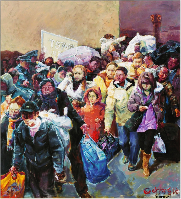 《春潮——回家過年》這幅作品是典型、真實的社會現(xiàn)實和人性本真的寫照,這個瞬間定格了一段讓多少人刻骨銘心的記憶,敘述了周期性的人類大遷徙——春運(yùn)。該畫所蘊(yùn)涵的是中國人心中那份最飽滿的希望。旅客是彼此都不認(rèn)識的陌生人,為了一個回家的目的,毫無距離地擠在一起,人物個性鮮明。畫家具有強(qiáng)大的創(chuàng)作能力和藝術(shù)表現(xiàn)力。(邢晨聲 文)