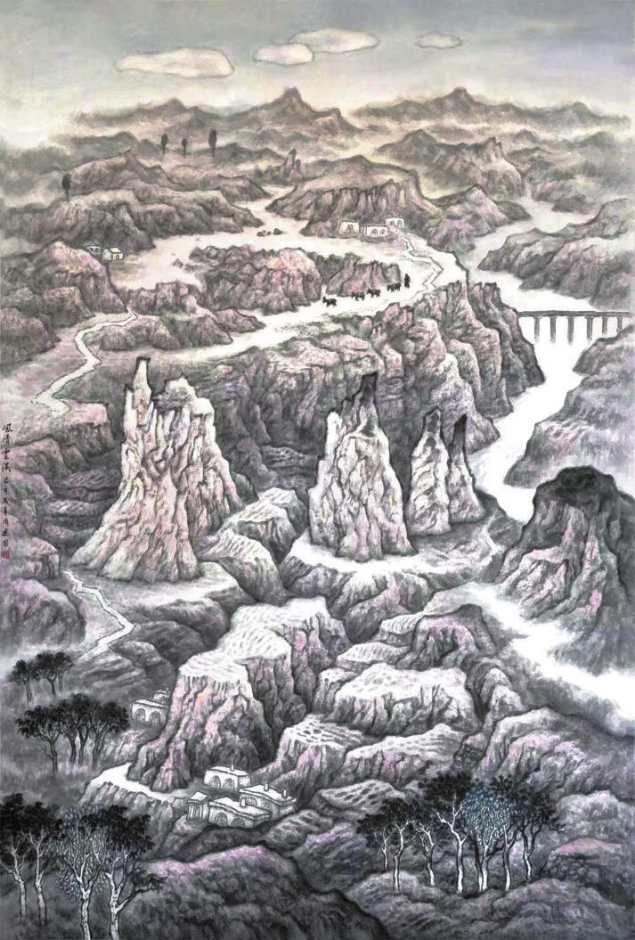 周建國(guó)對(duì)中國(guó)山水畫有著獨(dú)特見(jiàn)解,出版過(guò)畫集《中國(guó)美術(shù)名家精品鑒賞·周建國(guó)作品集》。他的創(chuàng)作之路主要分為兩個(gè)時(shí)期,前期追求中西融合,后期則回歸傳統(tǒng)。前期作品《曉月》《古原除夕》《月色》等,多取材于黃土高原,真切流露出其對(duì)黃土地的深情厚愛(ài):早上飄起的炊煙演繹著百姓的勤勞,喧鬧的腰鼓彰顯著鄉(xiāng)民熱愛(ài)生活的豪情,晨起上課的學(xué)生更是承載著當(dāng)?shù)厝藵M滿的希望。周建國(guó)將黃土地上的一草一木皆升華為獨(dú)特且富有個(gè)性的生命體,畫面處理側(cè)重將西方油畫的光影巧妙融入作品,寓動(dòng)于靜,動(dòng)靜相宜,彰顯“高貴的單純,靜穆的偉大”的內(nèi)在張力。同時(shí)將傳統(tǒng)山水繪畫的造型、空間結(jié)構(gòu)、筆法設(shè)色皆進(jìn)行改變——黃土溝壑的幾何化處理、筆墨色調(diào)的反復(fù)拿捏、耐人尋味的空間布局,都體現(xiàn)了其特殊的創(chuàng)作理念。相較前期,周建國(guó)后期的作品更加注重對(duì)內(nèi)在美的挖掘,如《風(fēng)月同天》《家園》《和諧家園》《生息之地》《太行月色》等代表作品,表達(dá)對(duì)祖國(guó)山河大川的熱愛(ài),走“外師造化,中得心源”之道,畫風(fēng)趨向率真,試圖突破中國(guó)山水繪畫的表象審美,追尋深層意義的表達(dá)。
