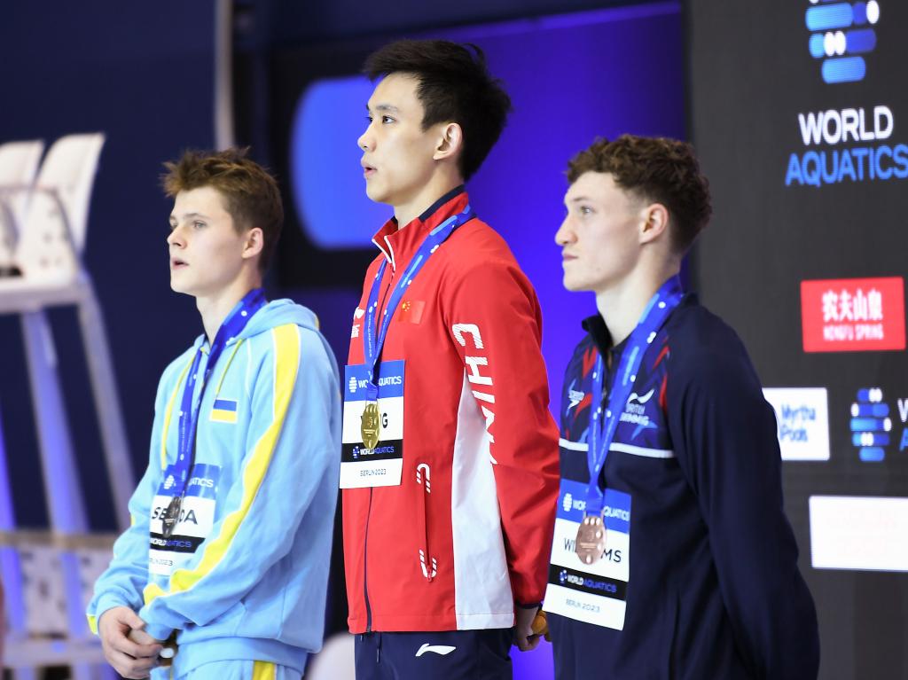 8月6日,冠軍中國選手楊昊(中)、亞軍烏克蘭選手謝列達(dá)(左)和季軍英國選手威廉姆斯在頒獎(jiǎng)儀式上。新華社記者任鵬飛攝