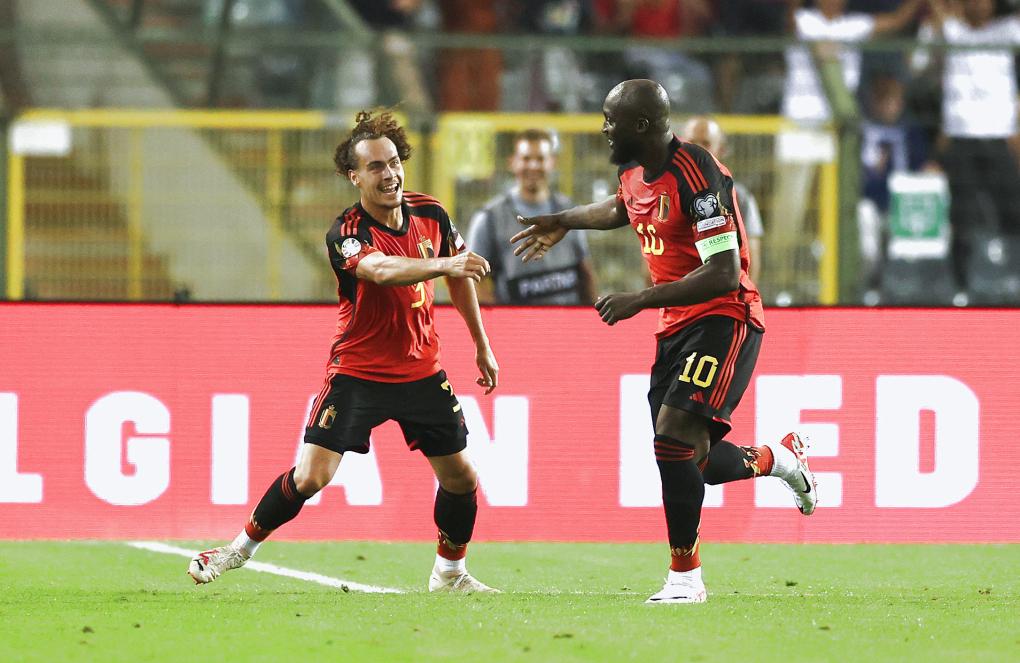 9月12日,比利時(shí)隊(duì)球員盧卡庫(kù)(右)進(jìn)球后和隊(duì)友蒂特慶祝。新華社記者趙丁喆攝