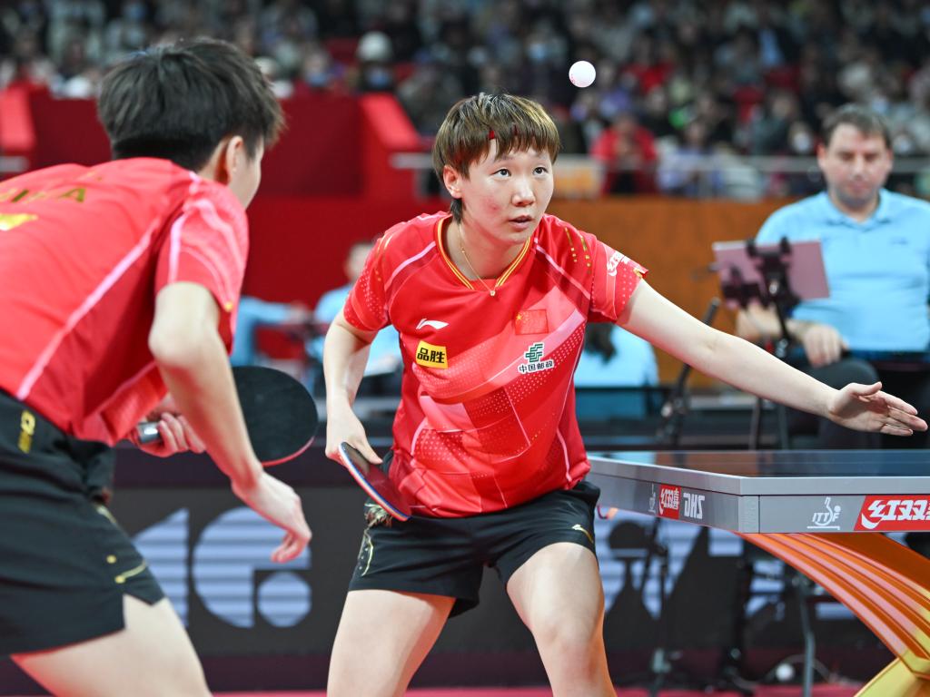 12月4日,中國(guó)隊(duì)組合林高遠(yuǎn)/王曼昱(右)在混雙比賽中。新華社記者 王曦 攝