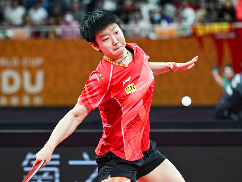 12月4日,中國(guó)隊(duì)選手孫穎莎在女單比賽中回球。新華社記者 王曦 攝