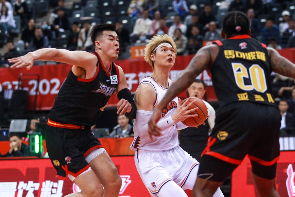 1月2日,上海隊球員王哲林(中)在比賽中進攻。新華社發(fā)(彭志剛攝)