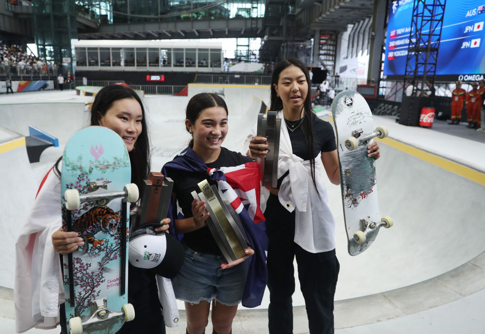5月19日,冠軍澳大利亞選手阿麗莎·特魯(中)、亞軍日本選手開(kāi)心那(右)與季軍日本選手四十住櫻在頒獎(jiǎng)儀式后合影。當(dāng)日,在巴黎奧運(yùn)會(huì)資格系列賽上海站滑板女子碗池決賽中,澳大利亞選手阿麗莎·特魯奪得冠軍,日本選手開(kāi)心那與四十住櫻分獲二、三名。新華社記者 賈浩成 攝