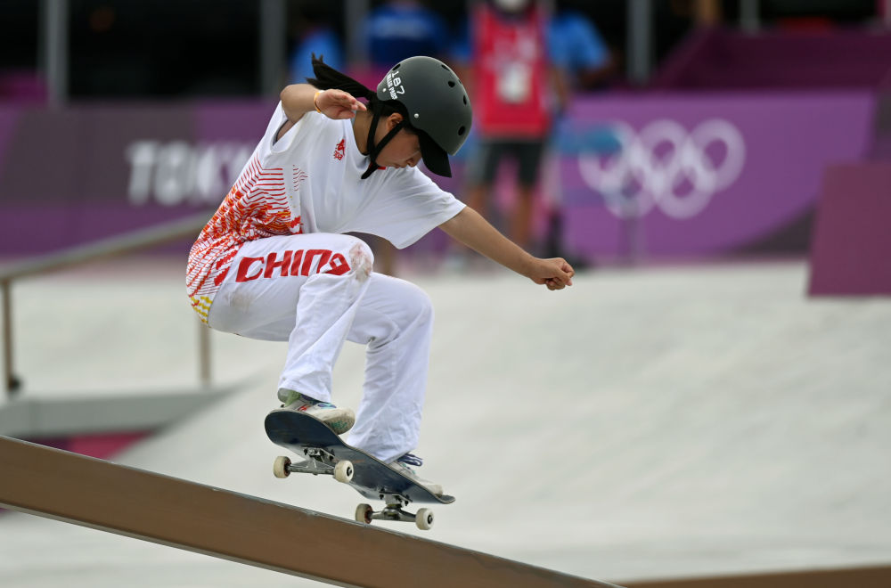 2021年7月26日,中國(guó)選手曾文蕙在比賽中。當(dāng)日,在東京奧運(yùn)會(huì)女子滑板街式賽中,中國(guó)選手曾文蕙闖入決賽,并最終獲得第六名。新華社記者 李尕 攝