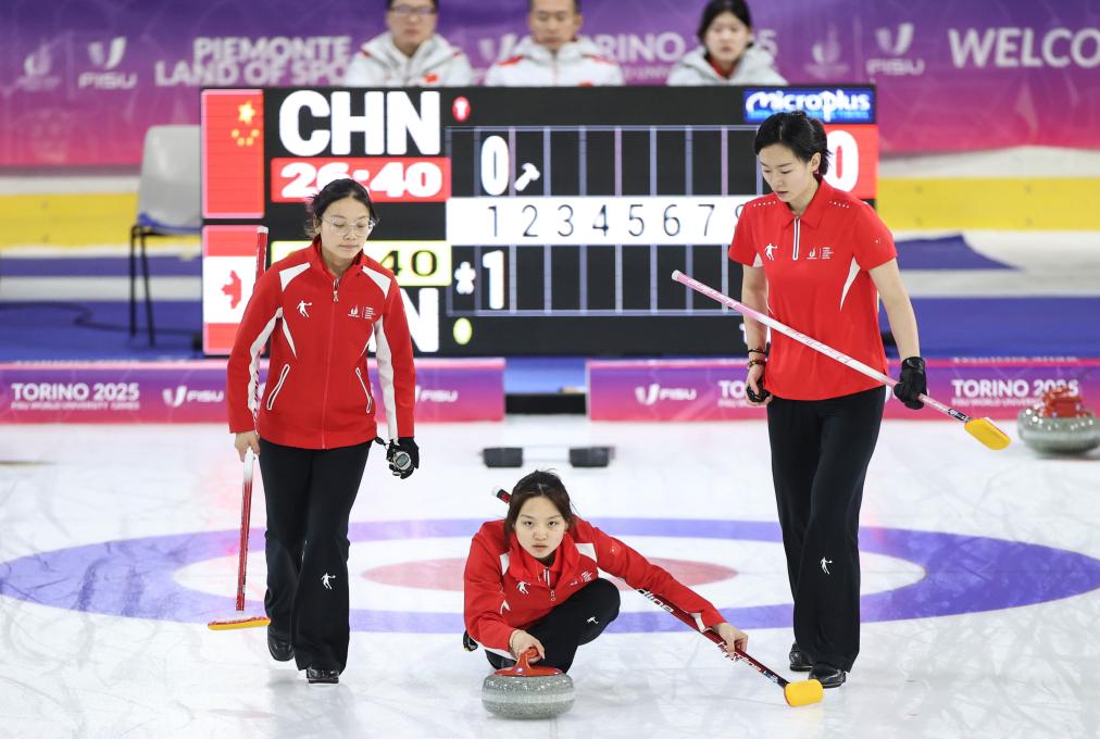同樣在塔佐利冰上運動中心進行的還有冰壺比賽,由北京體育大學(xué)學(xué)生尹子怡、渠偌萱、譚斯婷、裴君杭、葉紫萱組成的中國女隊,先是在白天的比賽中以4:6不敵日本隊,隨后又在晚間的最后一輪循環(huán)賽中以3:6不敵加拿大隊,最終以5勝4負的成績排名循環(huán)賽第五,無緣四強。