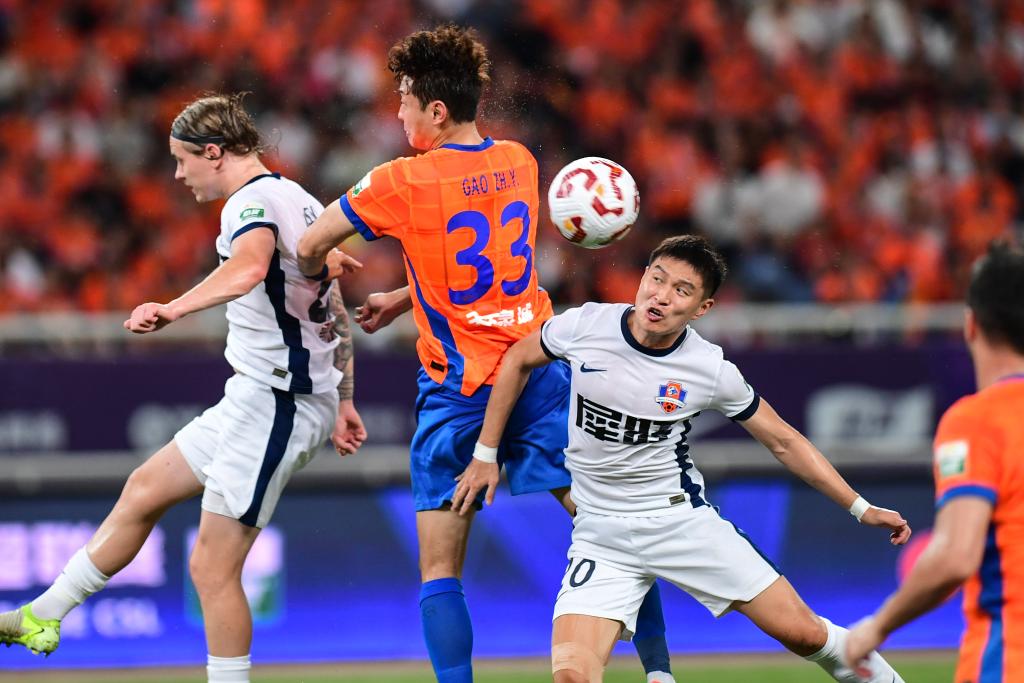 7月27日,山東泰山隊球員高準翼(中)在比賽中爭頂。新華社記者 朱崢 攝
