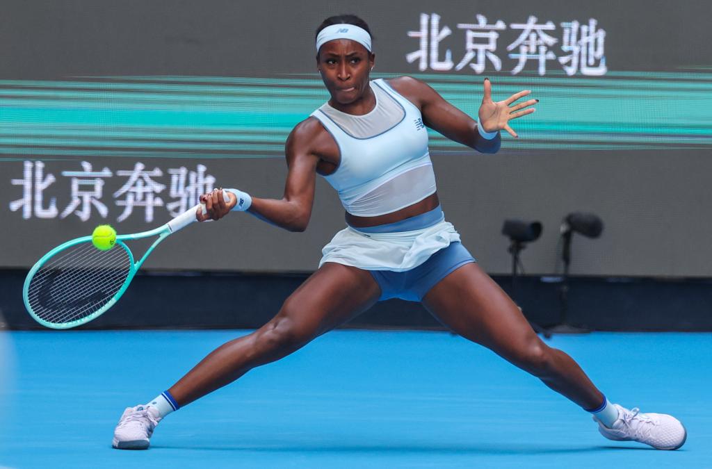 9月28日,高芙在比賽中回球。新華社發(fā)(馬子涵攝)