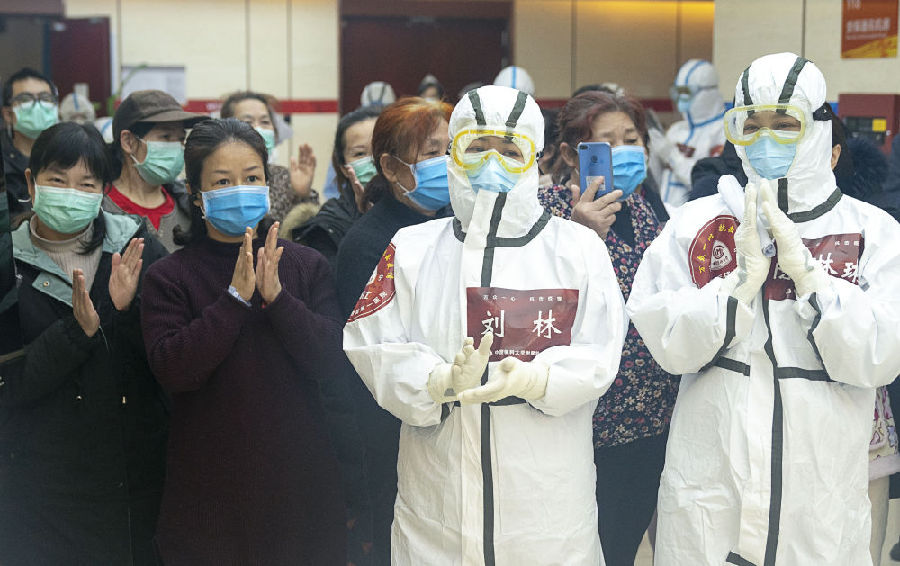 2020年3月8日,女性醫(yī)護(hù)人員和女性患者共同參加武昌方艙醫(yī)院內(nèi)“三八”婦女節(jié)活動 (新華社記者熊琦 攝)