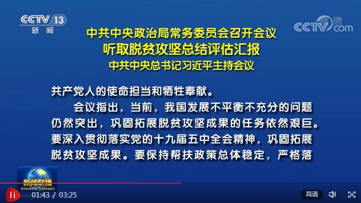 12月3日,中共中央政治局常務(wù)委員會(huì)召開會(huì)議,聽取脫貧攻堅(jiān)總結(jié)評(píng)估匯報(bào)。習(xí)近平總書記主持會(huì)議并發(fā)表重要講話。在講話中,總書記總結(jié)了黨的十八大以來脫貧攻堅(jiān)工作取得的成績,肯定了各級(jí)黨委和政府以及社會(huì)協(xié)同發(fā)力、合力攻堅(jiān)的卓越付出。央視網(wǎng)《聯(lián)播+》特梳理講話及會(huì)議要點(diǎn),以饗讀者。