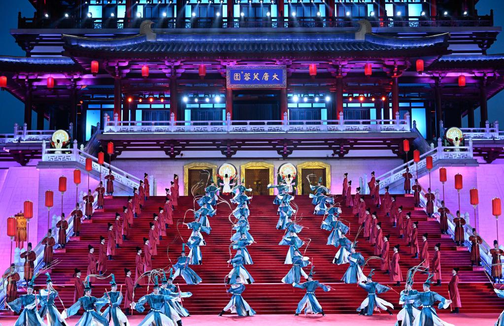 5月18日晚,出席中國-中亞峰會(huì)的中亞國家元首夫婦陸續(xù)抵達(dá)陜西省西安市大唐芙蓉園,參加在這里舉行的歡迎儀式。這是演員在歡迎儀式上表演。(新華社記者申宏攝)