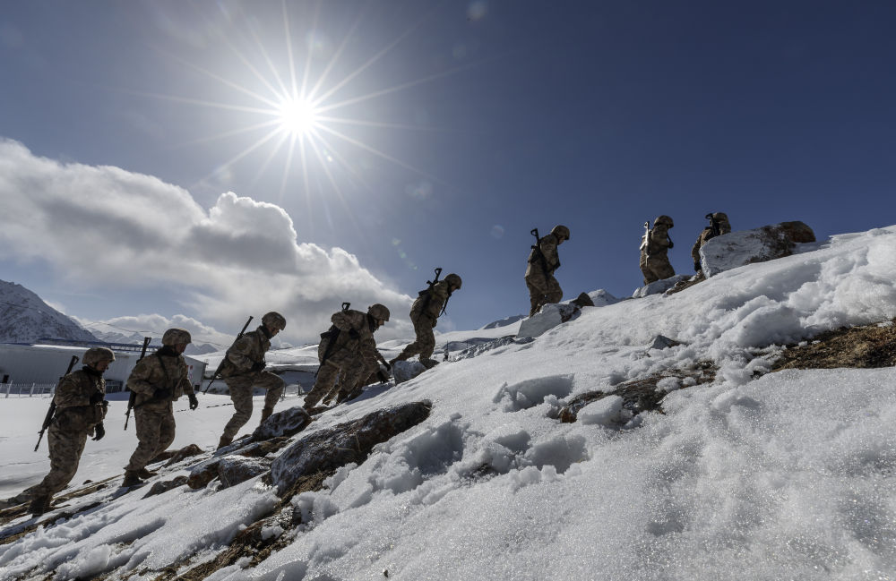 位于帕米爾高原的新疆軍區(qū)某邊防團(tuán)紅其拉甫邊防連的戰(zhàn)士在巡邏(2023年4月13日攝)。新華社記者 費茂華 攝